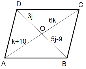 BO = OD 5j - 9 = 3j 5j - 3j = 9 2j = 9 j = 4.5 |