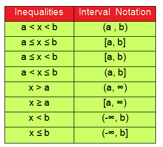 To convert inequalities into interval notation, we need to know the table below.
