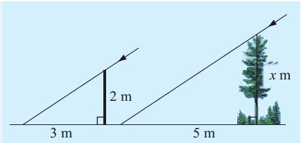 At 4 pm one day the shadow of a pine tree was 5 m long. At the same time a 2 m long broom handle had a shadow which was 3 m long. How high is the pine tree?