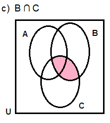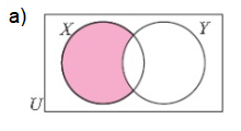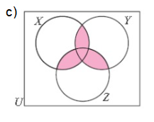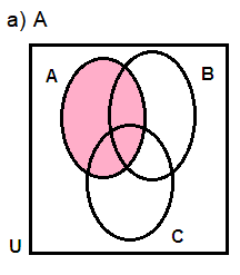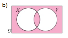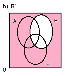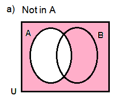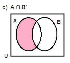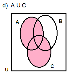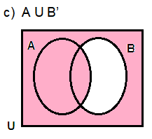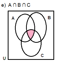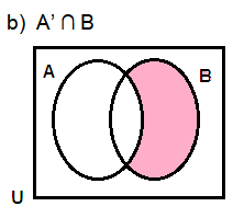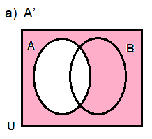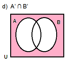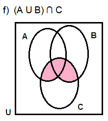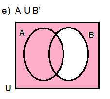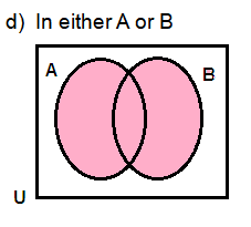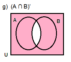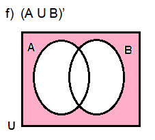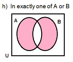 e) A U B’ f) (A U B)’ g) (A ∩ B)’ h) In exactly one of A or B |