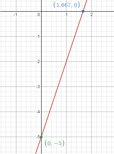 x-intercept: y = 0 3x - y = 5 3x - 0 = 5 3x = 5 x = 5/3 (5/3, 0) |