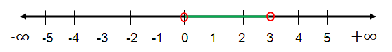 Since the given inequalities 0 < x < 3 (less than and less than), we draw the line from 0 with an unfilled circle to 3 with an unfilled circle on the number line.