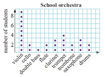 The dot plot shows the numbers of students playing various instruments in the school orchestra.