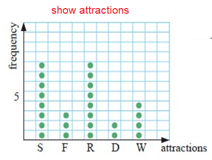 Students voted the most popular attractions at the local show to be the side shows (S), the farm animals (F), the ring events (R), the dogs and cats (D), and the wood chopping (W). The students in a class were then asked to name their favorite.