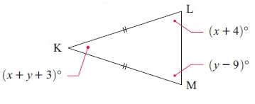 KLM is an isosceles triangle. Find x and y and hence find the measure of the angle at K.