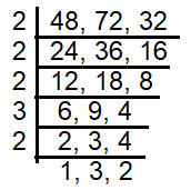 LCM (48, 72, 32) = 2 x 2 x 2 x 3 x 2 x 3 x 2